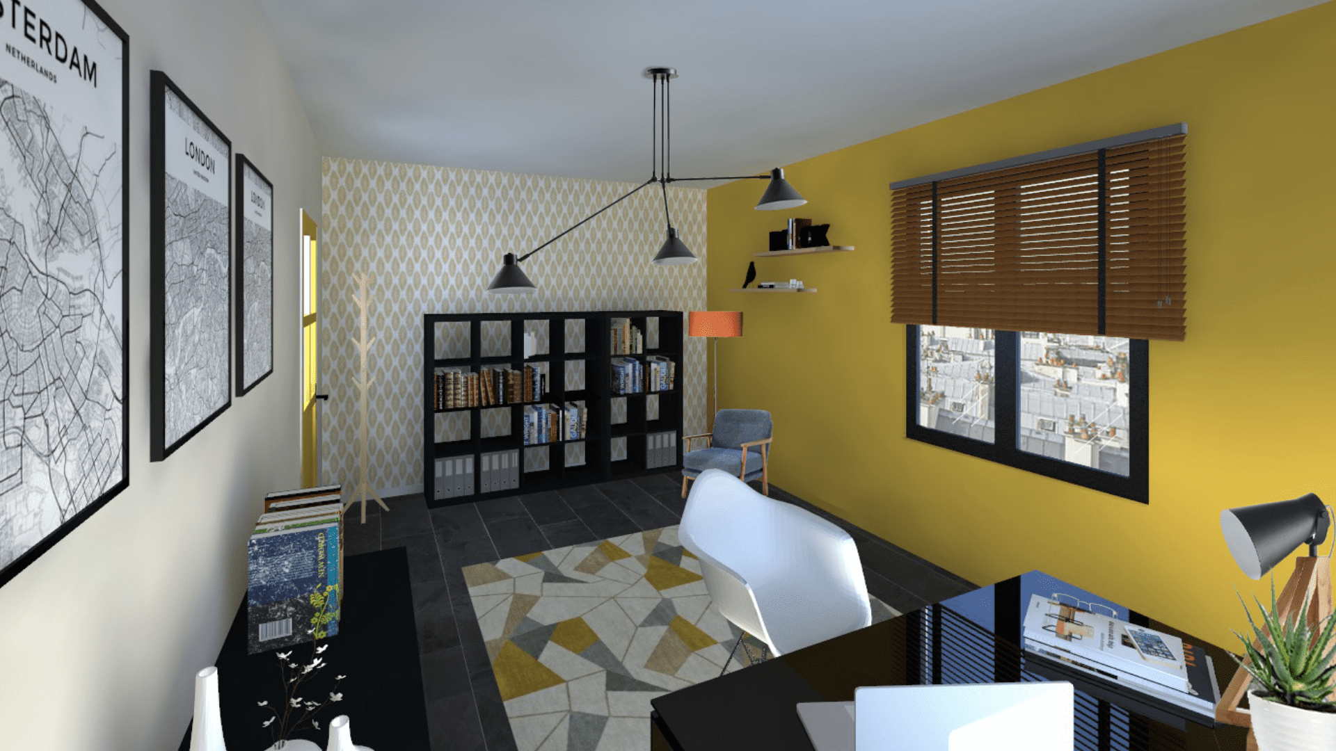 Afin de donner une ambiance inspirante, lumineuse et dynamique j’ai opté pour la couleur jaune avec des éléments aux motifs géométriques. La touche de noir sur certains objets donne une ambiance contemporaine et design.
