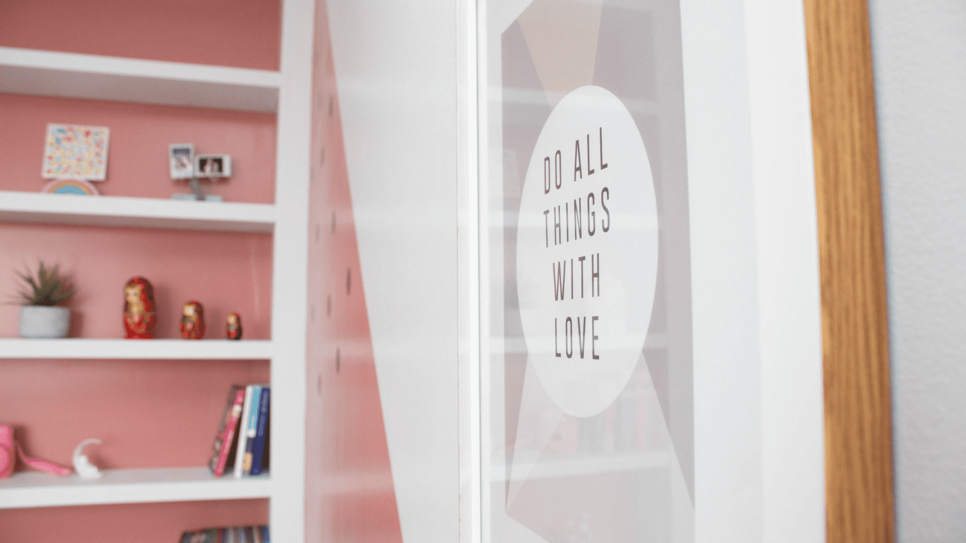 Afin de respecter le cahier des charges, j’ai donc opté pour du gris et du rose, et du doré dans l’accessoirisation. Pour donner de la personnalité au projet, je décide de lui fabriquer une bibliothèque en tête de lit, cela permet un gain de place dans la chambre en exploitant la hauteur sous plafond. J’accessoirise donc l’ensemble d’objets dorés et ethniques pour le plus grand plaisir de Manon.